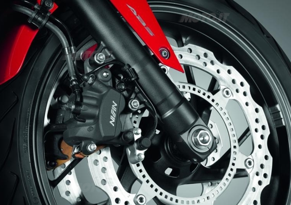 Sui cerchi a 6 razze sdoppiate in alluminio pressofuso sono montati pneumatici sportivi nelle misure 120/70-ZR17 e 180/55-ZR17. L’impianto frenante con ABS a due canali di serie può contare su grandi dischi wave anteriori da 320 mm, morsi da pinze a 2 pistoncini, e sul disco wave posteriore da 240 mm con pinza a singolo pistoncino.