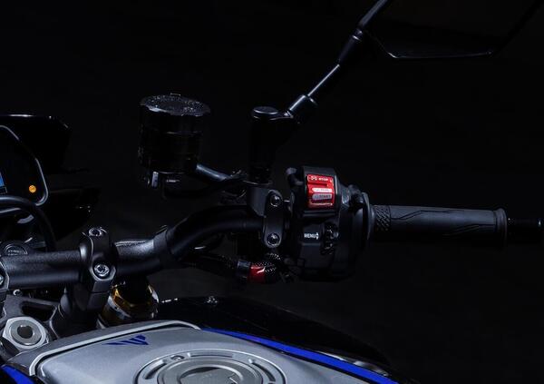 Le differenze continuano nell'impianto frenante, dotato di raccordi in treccia d'acciaio, ma anche nell'estetica, con l'adozione del puntale aerodinamico e della livrea Icon Performance che fa il verso a quella utilizzata sulla YZF-R1M.