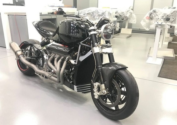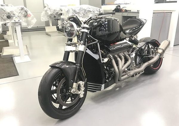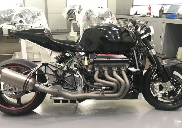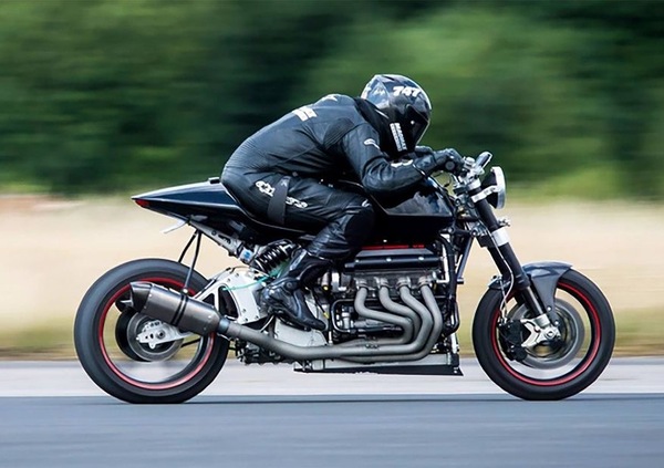 La moto che vedete nelle foto è stata completamente autocostruita, con un propulsore V8 da 3.000 cc che, in versione omologata (in Germania, con il TUV...) dovrebbe erogare fra i 420 e i 480 cavalli, con la possibilità di arrivare a 500 con carburanti speciali.