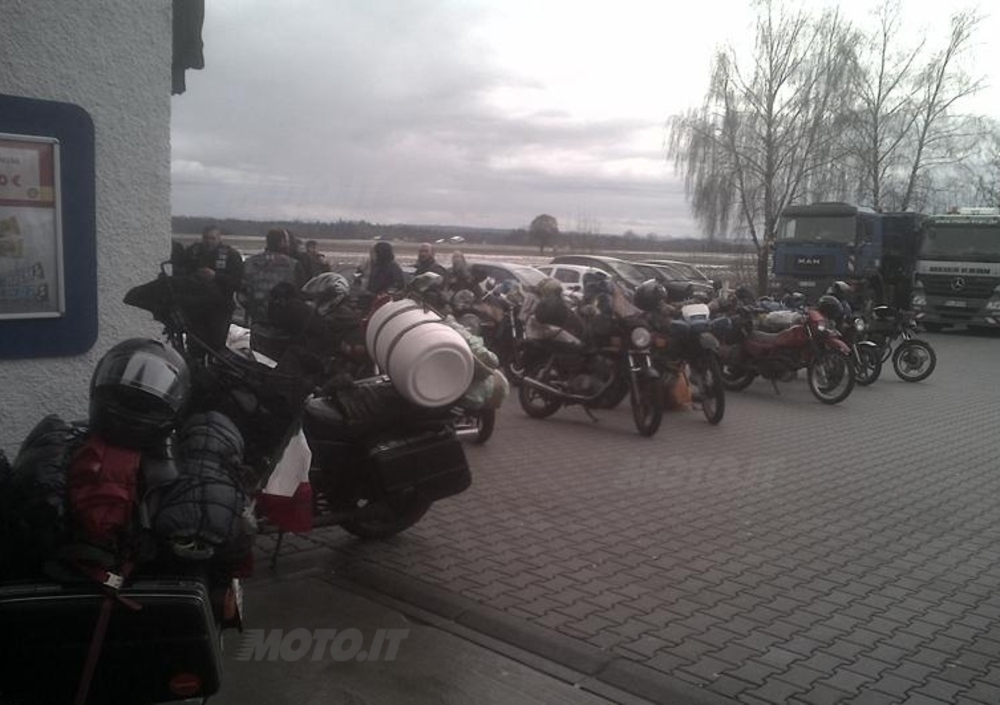 Solo il tempo per benzina più "cambio d'acqua al merlo" e si torna subito in sella. Il meteo è buono, soprattutto per le temperature. Rispetto agli anni passati ci sta andando di lusso, speriamo che non cambi. Anche il Brennero, di solito il punto più freddo, lo superiamo senza difficoltà. L'Africa Twin più che una moto sembra il camion di un "basolone" carica come non mai di salami, pentole, busecca, minestrone, carne di maiale, la slitta, e tutti gli effetti personali.