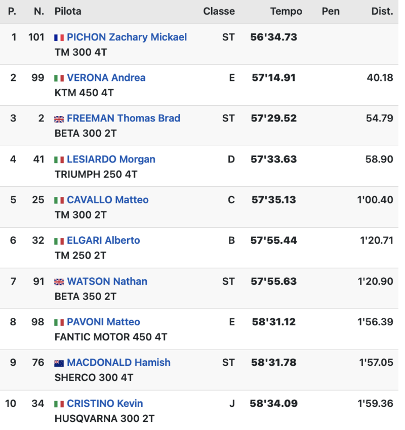 Pietro Scardina, TM, un altro trasferimento importante dell’inverno, vince la prima della 125. Alberto Elgari, TM, si aggiudica la 250 2T. Matteo Cavallo , TM, la 300, Andrea Verona, KTM, la 450, Manuel Verzeroli, TM, la Junior. E Zachari “Zac” Pichon, TM, la Stranieri e l’’Assoluta”, ça va sans dire. Noterete, come ho notato io, che si insiste sul quel nome di quelle Moto, TM: ebbene sì. Jarno Boano non solo ha messo su uno squadrone, ma appare perfettamente in grado di far la parte del leone.