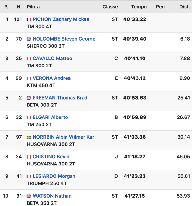 A onor del vero, le prime due prove di Viareggio sembrano anche dire che nelle dinamiche iniziali delle singole classi non c’è lo stesso livello di competitività dell’Assoluta (o della Stranieri). L’inizio del Campionato ci dice, infatti, che l’assetto classe per classe è al momento già ben definito. Pietro Scardina, TM, ha vinto la 125, Aberto Elgari, TM, la 250 2T, Matteo Cavallo, TM, la 300, Morgan Lesiardo, Triumph, la 250 4T, Andrea Verona, KTM, la 450 e Kevin Cristino, Husqvarna, la Junior.
