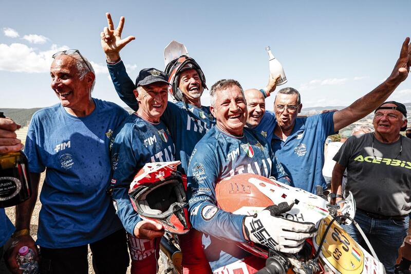 Tranquilli. È solo un falso allarme. Il primo giorno è Prova di Accelerazione, come abbian detto, poi due giorni di Enduro… puro, infine, come da tradizione, il gran finale sulla Pista di Cross di San Severino Marche. E sono quattro giorni in cui la Storia si ripete, rafforzando la nuova tradizione del Trofeo Vintage. È ancora e sempre la Squadra di Team Manager Franco Mazzoleni, che si impone in un crescendo ovviamente irresistibile che porta alla terza Vittoria azzurra consecutiva. Enrico Tortoli (KTM 250), Giorgio Grasso (Kramer 250) e Tullio Pellegrinelli (Puch Frigerio 347) staccano per la Maglia Azzurra la vittoria del Veteran Vintage Trophy riservata alle Nazionali. Dietro al Team Italia ecco ancora la Francia, Borsotto, Magnaldi, Tirard, seconda e, quindi la Repubblica Ceca, Kavsky, Kotrla, Vojuvka, terza, con tre stupende Jawa.