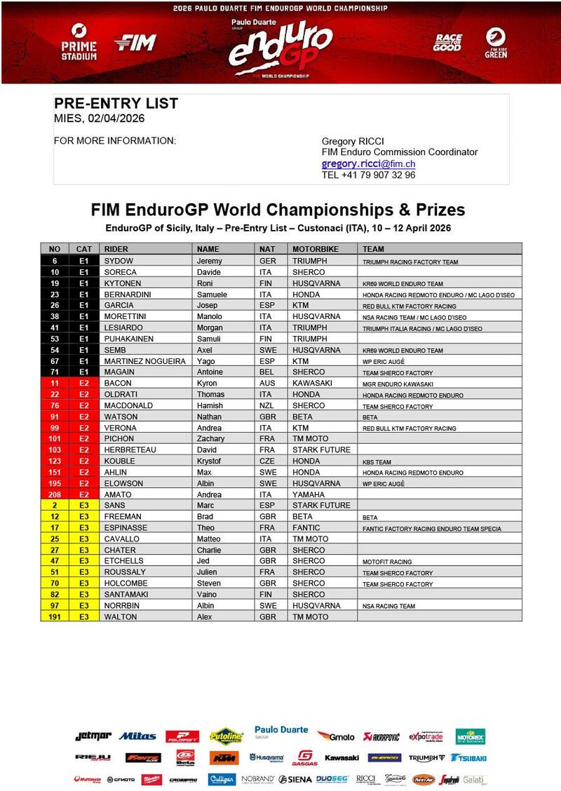 Italiani e Italiano. Segnali forti, dai Piloti e dai Team. La nostra bandiera, non ci sono obiezioni possibili, è Andrea Verona, otto Mondiali e quattro Sei Giorni tutto compreso. Passa “virtualmente” da GasGas a KTM, adattamenti minimi. Samuele Bernardini, Honda-RedMoto, e Morgan Lesiardo, Triumph-Mayr, hanno fatto bene lo scorso anno e, partiti con attenzione nell’Italiano, sono chiamati al banco della verifica. Molto attesi, anche, Kevin Cristino, passato al neonato Team Husqvarna-NSA-Albergoni (che ha messo in vetrina anche l’exploit di Albin Norrbin all’Italiano), e Pietro Scardina, la cui fortissima progressione viene raccolta e guidata dal Team TM-Boano.