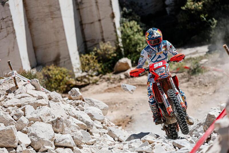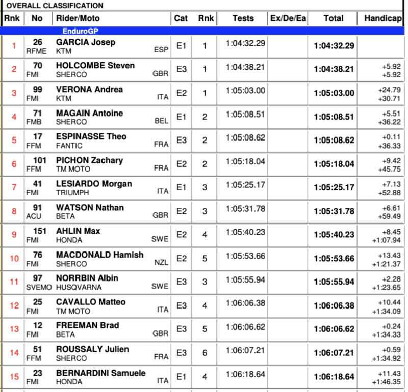 Il margine di Garcia sul secondo di classe, Antoine Magain, Sherco, e sul terzo, Morgan Lesiardo, Triumph è notevole, oltre mezzo e quasi un minuto rispettivamente. Il confronto della E2 si presenta in modo più equilibrato, Verona, Pichon e Nathan Watson, Beta-Dini, stanno in mezzo minuto, e si torna a debordare nella Enduro 3 di Holcombe, mezzo minuto a Theo Espinasse, Fantic, e oltre un minuto a Albin Norrbin, nuovo fenomeno di Husqvarna-NSA.