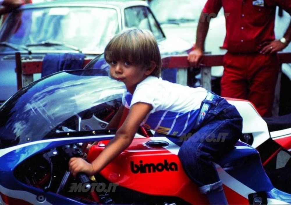 La cartolina fissata con la molletta da bucato alla forcella della bici per fare tac-tac-tac sui raggi e trasformarla in una moto, il bisogno divorante del motorino quando ancora mancavano anni all’età per guidarlo e le discussioni infinite con due genitori incapaci di capire; e poi le notti a leggere le riviste di moto, e la prima moto che ti ricordi ancora l’odore, i primi giri in pista (con una enduro! andava bene anche quella…), il gusto di una curva fatta veramente bene, della prima toccata col ginocchio sull’asfalto, delle acrobazie che qualche volta si fanno anche se è folle e se ti beccano sei rovinato.