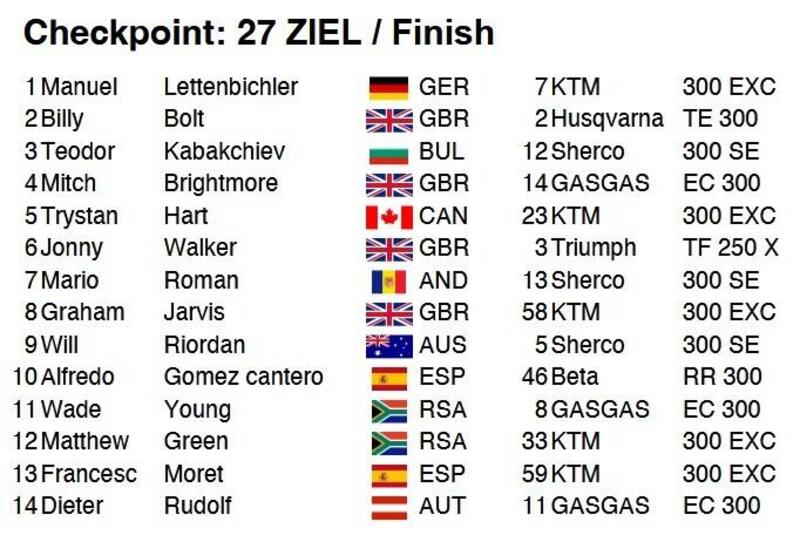 Billy Bolt ci ha provato, in fondo è l’avversario storico del tedesco, ma si deve accontentare del pur eccezionale secondo posto. Autore della spettacolare partenza veloce, l’inglese ha tenuto fino alla sezione del Carl's Dinner, poi è stato sorpreso da una salita che Mani invece ha superato in volata. Teo Kabakchiev, Jonny Walker, Trystan Hart e Mitch Brightmore si sono giocati da vicino il podio finale. L’ha spuntata Brightmore su Kabakchiev. Jonny Walker ha portato la Triumph 250cc 4 tempi a un bellissimo sesto posto.