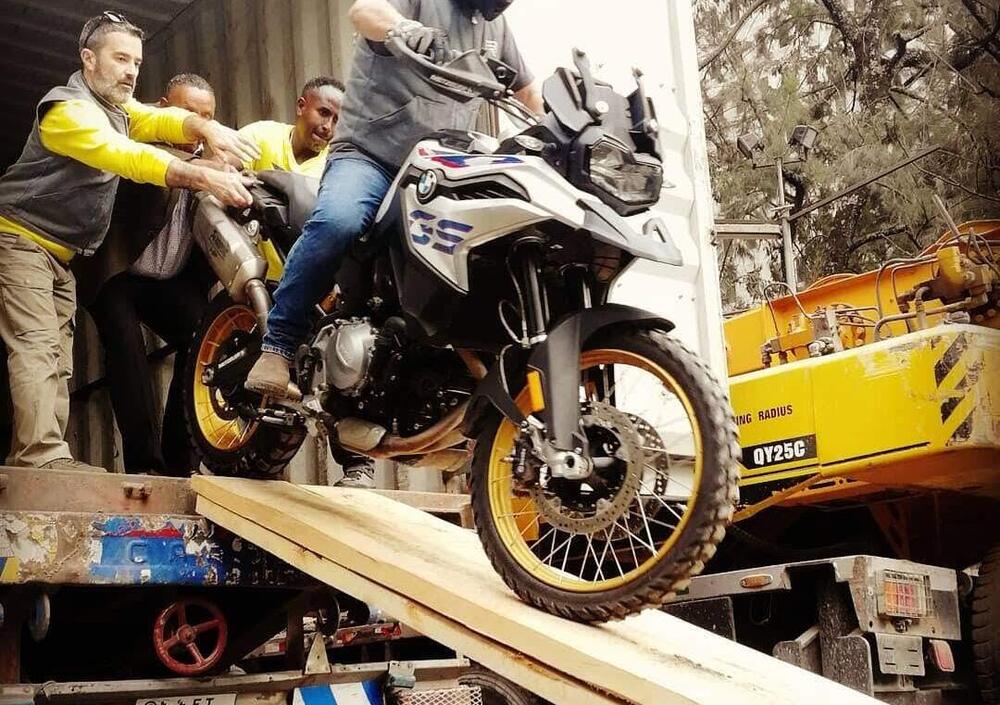 Moto scaricate dal container giunto da Gibuti dopo un lunghissimo viaggio in nave. Abbigliamento pronto (con tutte le protezioni e casco rigorosamente integrale). E poi c'è la borsa immensa della Mosko che va sulla sella con: tenda, materassino, gavetta, medicinali, piumino, abbigliamento, gopro, cibo e acqua. Dopo il saluto dell'ambasciatore italiano, siamo pronti per l'avventura.