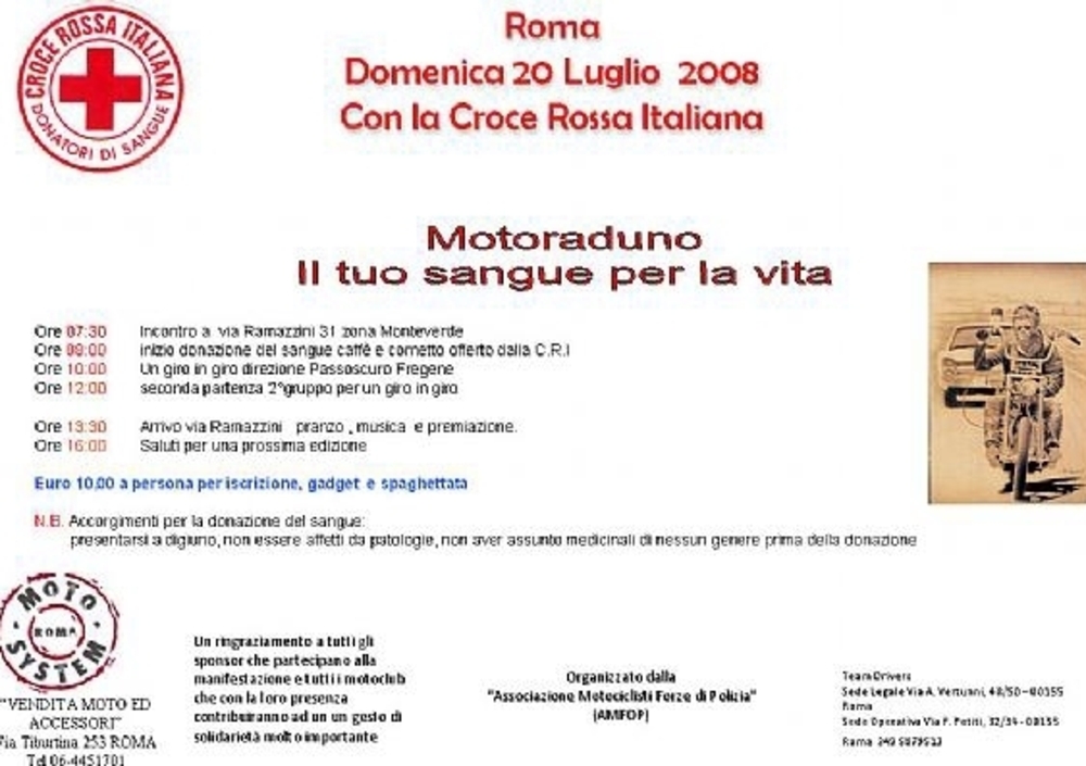 L'Associazione Motociclisti Forze di Polizia (A.M.Fo.P.) è lieta di informare che in data 20 luglio 2008, avrà luogo l'evento denominato "Il Tuo Sangue per la Vita", realizzato in collaborazione con la Croce Rossa Italiana.