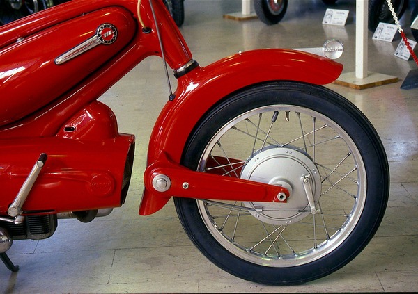 Spicca qui l’Ariel con le sue forcelle in lamiera stampata dal tipico styling utilizzate sulle 250 bicilindriche Arrow, presentata nel 1958, e Leader, entrata in produzione l’anno successivo. Pure sulla Ariel Pixie degli anni Sessanta è stata impiegata una sospensione analoga. Quello della casa inglese è stato però un caso pressoché unico, per quanto riguarda il dopoguerra. Anche se in questa sede stiamo parlando solo di moto, è interessante ricordare che le sospensioni a ruota tirata hanno invece avuto sempre una notevole diffusione sugli scooter.