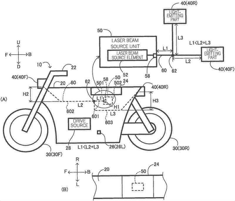L’idea è semplice e per questo geniale. Se il problema era il peso e il costo di ogni singola lampada Laser, Yamaha ha immaginato e brevettato un sistema che prevede l’istallazione di un singolo Laser nel cuore della moto, in una zona centrale, vicino al baricentro della stessa; da qua partiranno diversi cavi ottici che porteranno l’illuminazione ad ogni singola utenza, fanali anteriori, posteriori, frecce, cruscotto. Qualsiasi cosa richieda una illuminazione, di servizio o per illuminare la strada, questa potrà contare su un “generatore” di luce, tremendamente efficace ed efficiente.