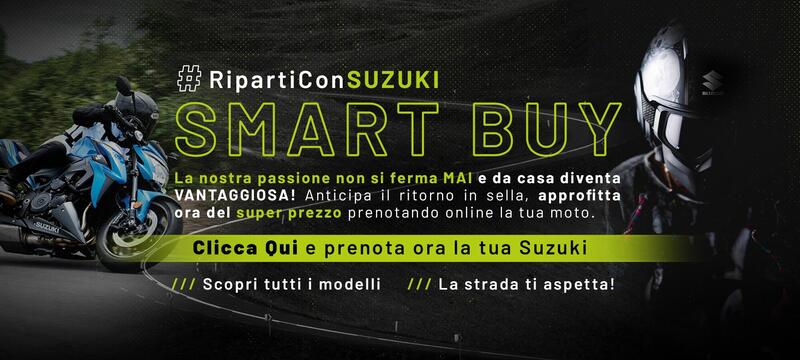 Chi avesse già le idee chiare su quale sarà la sua prossima Suzuki può approfittare ancora per qualche giorno di una buona opportunità. Fino al 18 maggio sarà attivo il programma Suzuki Smart Buy, l’iniziativa digitale che dà la possibilità di prenotare una moto o uno scooter attraverso la piattaforma di e-commerce Suzuki.
