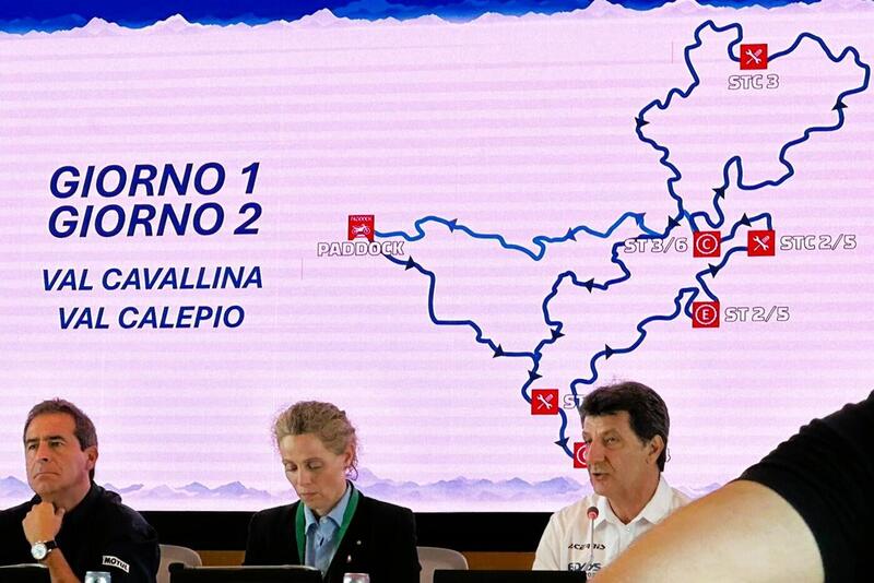 Su palco di Bergamo, per la presentazione ufficiale, Giuliano Piccinini, orgoglioso presidente del Moto Club organizzatore, Fabio Muner, marketing FMI, Paolo Buratti, direttore di gara, Pedro Mariano, race director FIM, Federica Picchi Sottosegretario allo Sport e Giovani di Regione Lombardia, Alfredo Sponga consigliere federale FMI in rappresentanza del presidente Copioli, Valter Andreoli consigliere Motoclub Bergamo e responsabile paddock.