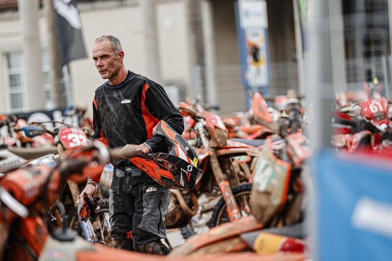 La bandiera nazionale di rappresentanza è stata raccolta dai nostri nel Team Club Award, il Moto Club Italia, che la fa sventolare ogni giorno in cima alla lista. Terzo giorno sensazionale. Le sei Speciali sono tutti vinte dagli italiani, e gli italiani vincono tutti, Enrico Rinaldi, Pietro Scardina, due, Macoritto, tre. Un “monomarca”! Macoritto vince, Macoritto e Rinaldi sul podio, solo il francese Enzo Marchal a tenere giù dai tre gradini Scardina. Il Team Italy vola al comando, oltre 11 minuti sui soliti, bravi, francesi del Puy En Velay. Mi fa impazzire il mio amico Johnny Aubert, 44 anni, quindici anni fa due volte Campione del Mondo e una volta vincitore del Trofeo Mondiale con la Francia. È schierato con il Team KTM All Star insieme a Andreas Lettenbichler e Chris Birch. Johnny è 15°, 6° e 9° nei tre giorni di 6 Giorni sin qui. Qualcuno lo definisce ancora un “ex”!!!