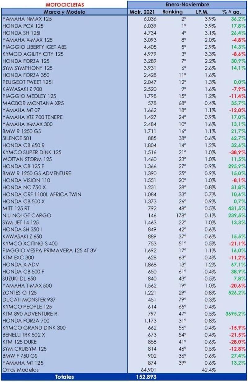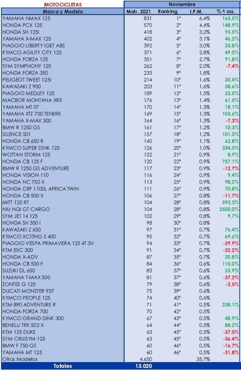 N.B. Le tabelle qui sotto indicano le classifiche dei cinquanta modelli più venduti, sempre oltre i 50 cc, nel mese di novembre e nel periodo gennaio-novembre 2021.