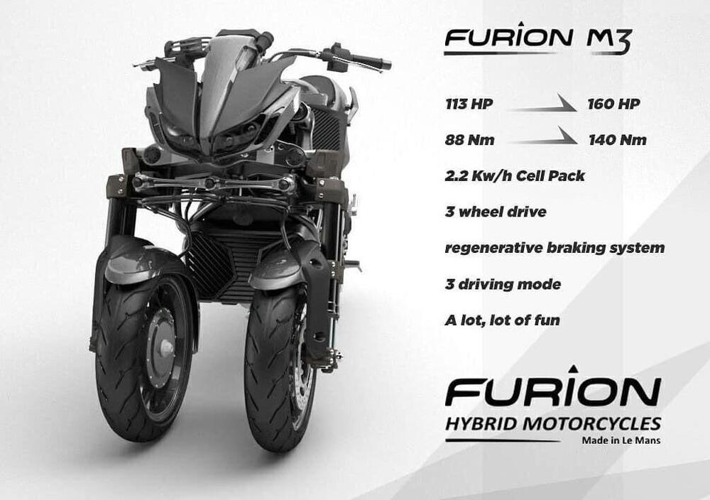 Furion, con sede a Le Mans, ha già presentato nel 2017 un concept di una moto ibrida dove il motore endotermico è un birotore Wankel e ha in produzione la M1 su base Yamaha YZF-R6 con un motore elettrico supplementare nel mozzo ruota posteriore: una moto da 30.000 euro che garantisce per un'autonomia di 40 chilometri 45 cavalli in più.