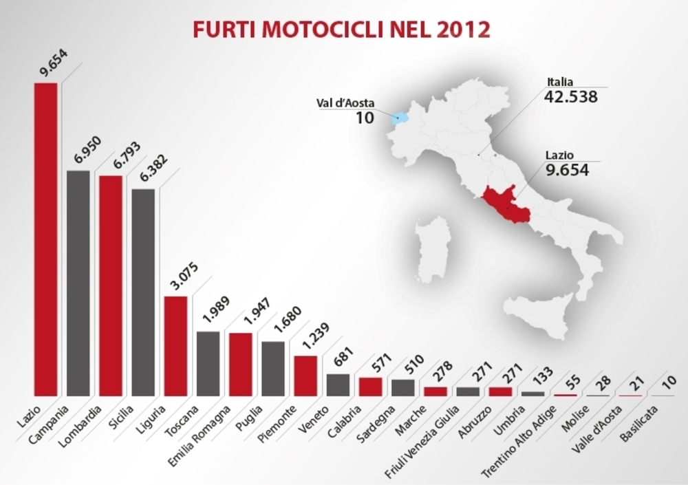 Le macchine rubate in Italia nel 2013 sono state 112.000 circa, a fronte di una parco circolante di quasi 37 milioni di vetture, quindi con un rapporto dello 0,3% contro quello delle 0,6% (in questo caso riferito al 2012) delle due ruote. Come dire che in Italia vengono rubate il doppio delle moto rispetto alle auto.