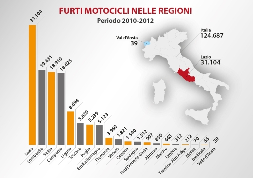 I furti di moto e scooter continuano a colpire duramente. Nel triennio 2010-2012, l'ultimo periodo del quale ci è stato è possibile avere i dati ufficiali, il totale dei furti delle due ruote a motore denunciati è stato pari a 124.678 unità. Parliamo di motocicli, quindi di moto e scooter immatricolati, in questa statistica sono esclusi i ciclomotori.