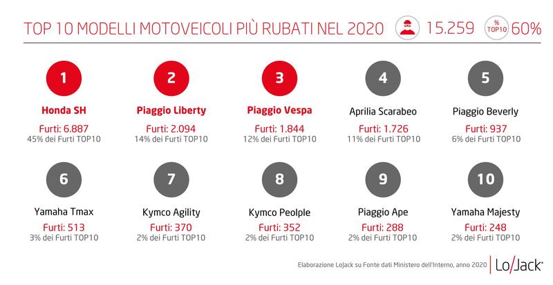 I veicoli più rubati sono gli Honda SH (6.887) che rappresentano circa il 25% del totale dei veicoli rubati. Al secondo posto di questa triste classifica trova spazio con il Piaggio Liberty (2.094), seguito dalla Vespa (1.844) e dall’Aprilia Scarabeo (1.726). Al sesto posto il T-Max (513).