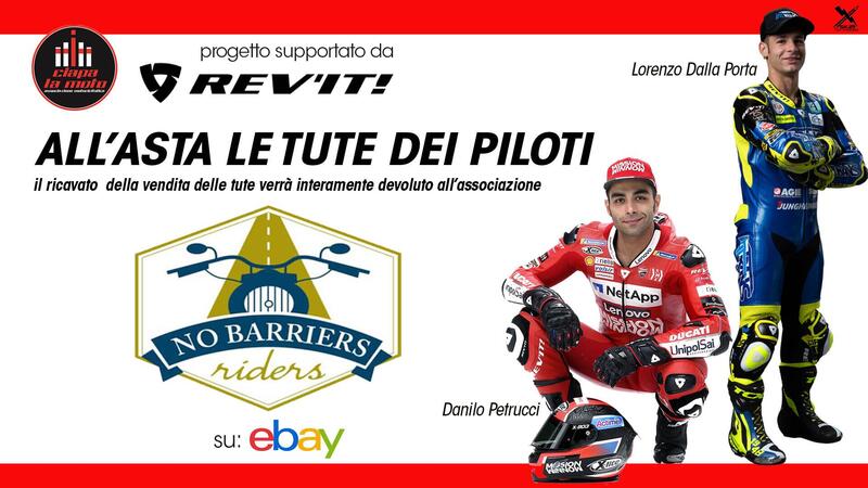 Questa volta Motosplash, Ciapa La Moto e Rev'it si uniscono per sostenere NO BARRIERS. Il 30 giugno, infatti, metteranno all'asta due cimeli per appassionati motociclisti: le tute indossate in due precise occasioni rispettivamente da Danilo Petrucci (Jerez-2, 26 luglio 2020) e Lorenzo Dalla Porta (Warm-up Brno Moto2, 9 agosto 2020). Le tute - come potete vedere dalle immagini nella gallery qui sopra - sono autenticate dal produttore e il ricavato della vendita andrà a sostenere i progetti di NO BARRIERS.