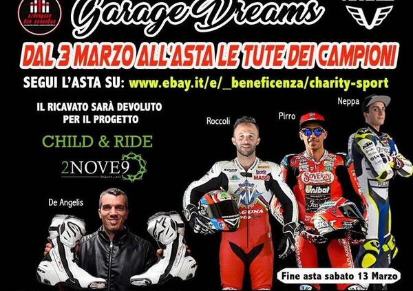Fino al 13 marzo sarà possibile concorrere a un’asta online per acquistare una tuta racing ufficiale Vircos appartenuta a Michele Pirro, Alex de Angelis, Stefano Nepa e Massimo Roccoli. Le tute saranno firmate e autenticate e il ricavato della vendita andrà a sostenere il progetto Child & Ride. Chi vuole, può passare da Motosplash, via Gardone 22 Milano, dal lunedì al sabato, tra le 10 e le 18, per vedere e toccare le tute di persona. I vincitori che si aggiudicheranno le tute dei piloti le riceveranno spedite direttamente da Aldo De Agnoi, proprietario della Vircos Services.