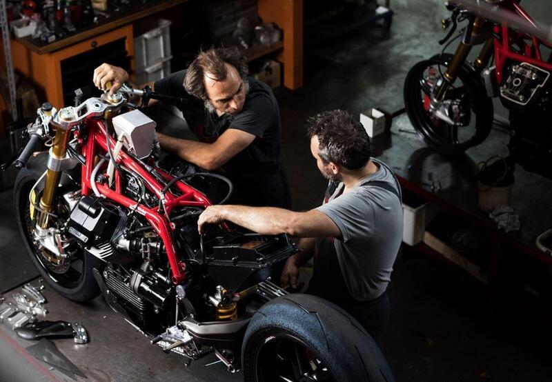 I due fratelli, un passato da piloti nella velocità internazionale, riparano, restaurano, realizzano kit di trasformazione e special Moto Guzzi.