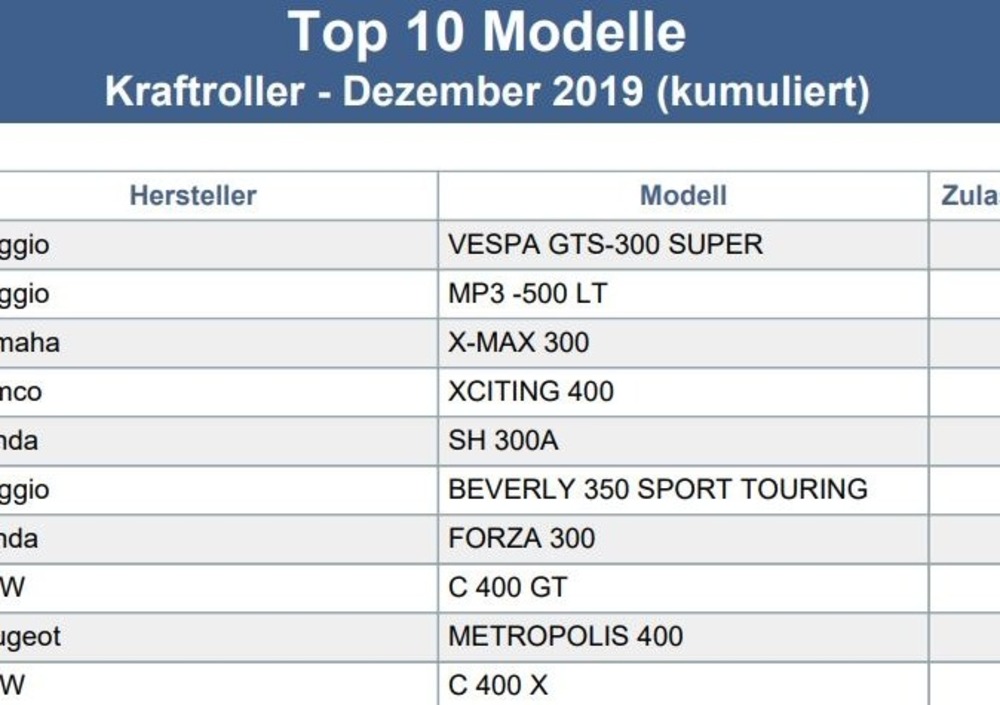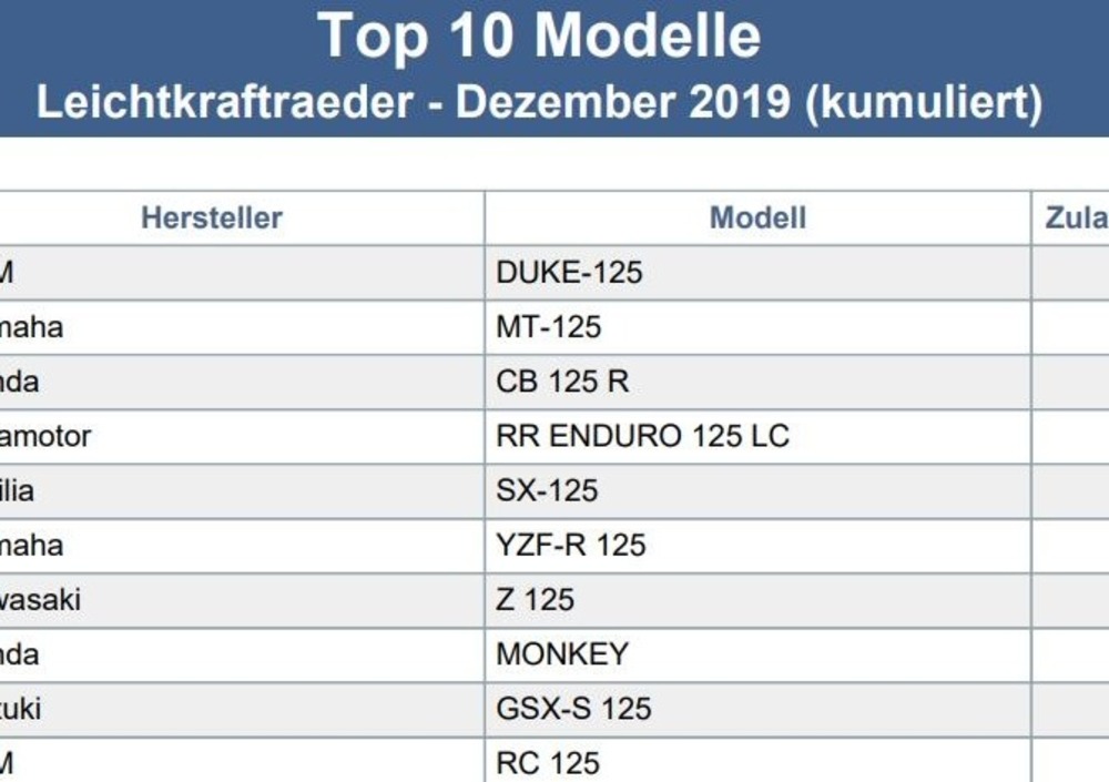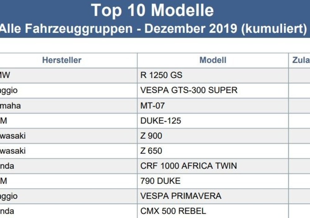 Tra i modelli BMW in classifica risaltano i numeri notevolmente maggiori ottenuti in Germania da S1000R ed S1000RR; Honda vende da parte sua vende molto meglio le CMX500 Rebel, CBR 500R e CB500F; Kawasaki Germania ci supera parecchio nelle vendite di Z900RS, Vulcan e Ninja 650; KTM mostra le maggiori differenze nelle vendite di SuperDuke 1290R e GT; Suzuki vende molto meglio la SV650 e poi la GSX-F750; le Harley-Davidson mostrano mediamente numeri maggiori, e Husqvarna piazza un numero alto di 701 Supermoto.