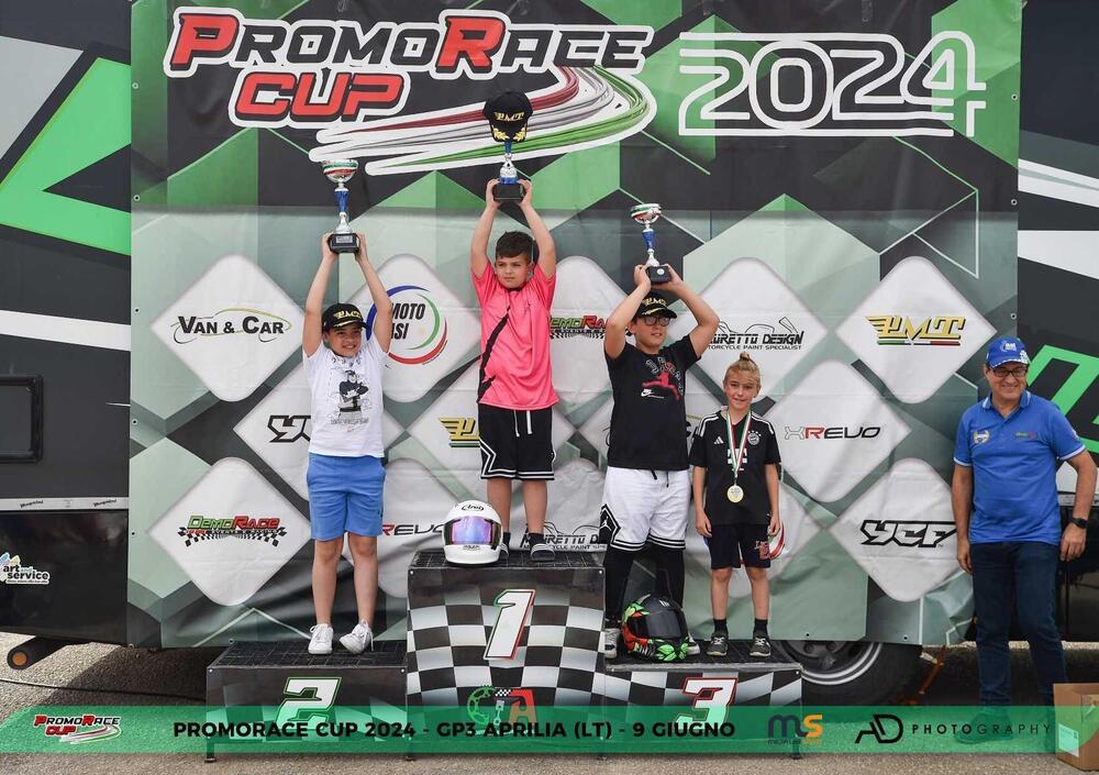 Per la categoria Mini Gp 190cc due le classi in griglia Under e Over. Pole man assoluto Tommaso Ubaldini della classe Under che firma un 57’’.139’’’, per la classe Over invece il più veloce è stato Gianluigi Gualdambrini del team DSC Racing che con il tempo di 59’’.516’’’ si aggiudica la sesta casella dello schieramento. Parte bene Ubaldini che mantiene la leadership della gara, ma i primi quattro rimangono compatti nelle prime fasi di gara. Ubaldini inizia a scappare per mettere un margine importante fra se e gli inseguitori. Luca Leonardi, Sebastian Ferrucci e Cristian Germani rimangono vicinissimi e provano il tutto per tutto nei sorpassi. Ferrucci tenta più volte l’attacco cercando di studiare il punto migliore della pista a suo vantaggio ma Leonardi riesce con delle belle staccate a resistere agli attacchi. Dopo ben tre tentativi abilmente studiati Ferrucci riesce a portare a casa con le unghie il sorpasso su Leonardi conquistando la seconda posizione. Gualdambrini dopo aver avuto diverso filo da torcere con i giovani del gruppo nelle prime fasi di gara si stabilizza in sesta posizione mettendo al sicuro la sua leadership di classe.