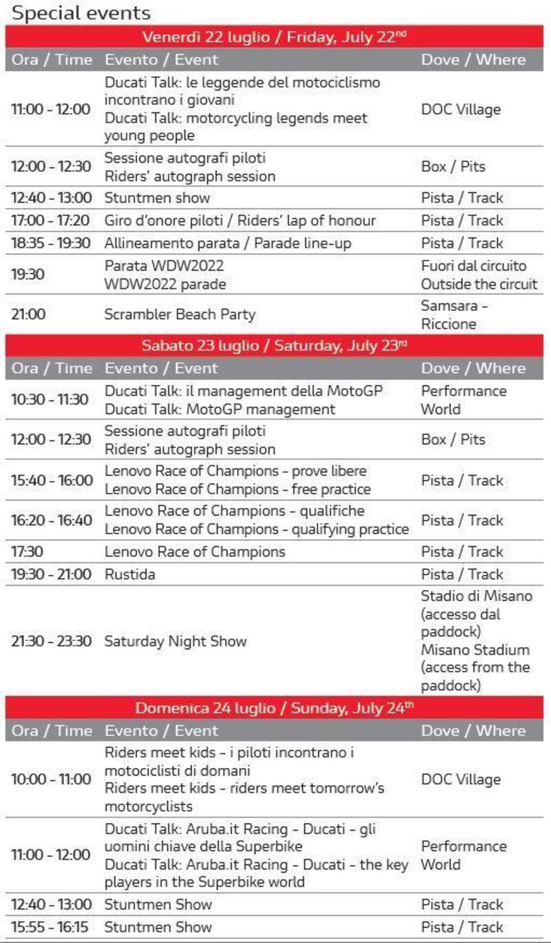 Ogni giorno il ricco programma prevede giri in pista, incontri con i piloti, talk, sfide, test ride su Ducati, taxi drive su Audi e Lamborghini, anteprime mondiali, riding experience dentro e fuori il circuito, su asfalto o sterrato, buon cibo e grandi eventi nel segno della convivialità e del piacere di stare insieme.