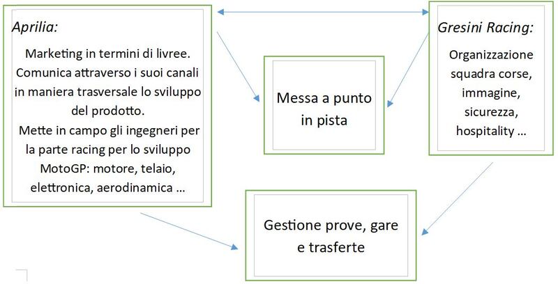 In questo progetto la condivisione e la responsabilità sono diverse tra Aprilia e Gresini Racing, come si può intravvedere dal sintetico schema seguente.