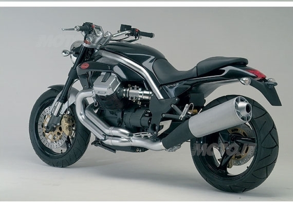 Tutto il temperamento del Griso, una “guardia del corpo” d’altri tempi, emerge dalle soluzioni estetiche inconsuete, con i travi superiori del telaio ad abbracciare l’originale serbatoio, il gioco degli scarichi che s’incrociano e, inevitabilmente, il richiamo alla tradizione affidato alle teste del mitico bicilindrico a V di 90° che sbucano ai lati.