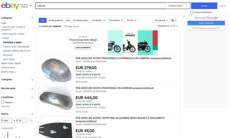 Anche in questo caso un'importante risorsa per togliersi d'impaccio e scoprire un mondo quasi sconosciuto con tutta la sicurezza del caso è la grande community di eBay , una risorsa globale che più volte vi abbiamo indicato come ottima per districarsi nell'universo degli accessori e che nel caso dei sidecar può veramente essere una mano santa. Il sidecar infatti è un po' una categoria ibrida a metà strada tra l'epoca e il contemporaneo: potrebbe tranquillamente capitarvi di cercare un ricambio per un veicolo degli anni '70 o di voler arricchire uno degli ultimi arrivi, se non di cercare un carrozzino da aggiungere alla vostra moto o più banalmente di fare la necessaria manutenzione con i prodotti corretti e nella quiete del vostro garage: anche questo fa parte del piacere di possedere un sidecar. In tutti questi casi, eBay è un aiuto prezioso, data la gigantesca estensione del marketplace globale e la possibilità di passare da compratore a venditore e viceversa nel volgere di un click, caratteristiche che all'interno della nicchia degli amanti del sidecar si rivelano ancora più efficaci.