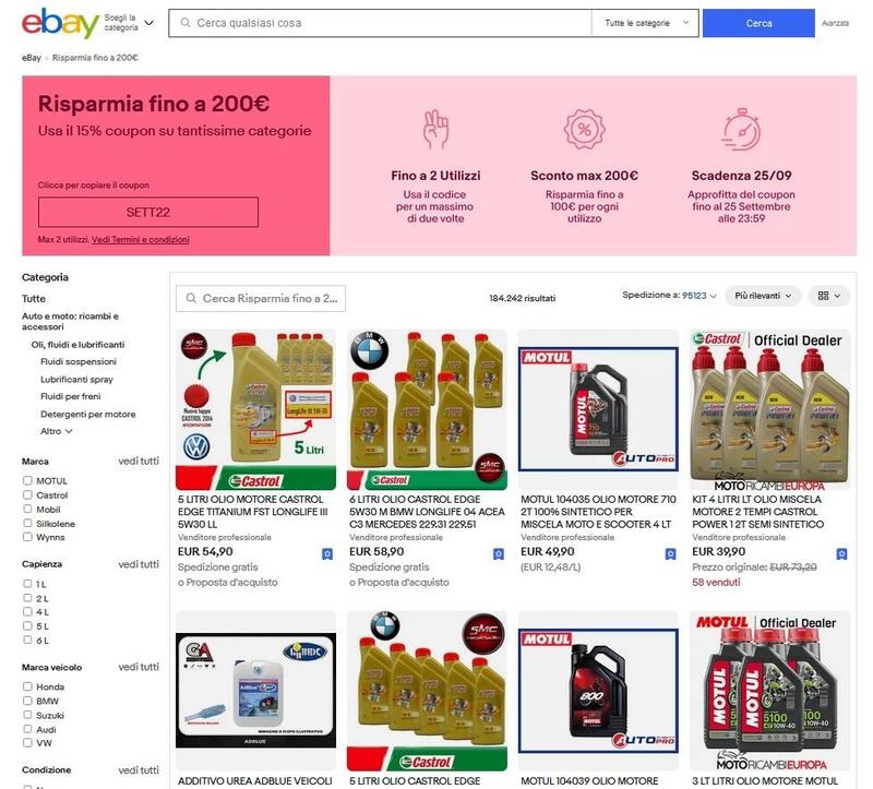 Indispensabile poi, specie se avete appena acquistato il vostro sidecar usato, provvedere a un tagliando motore completo: su eBay non è difficile trovare tutto quanto occorre a partire dall'olio motore. Se volete saperne di più sulla lubrificazione potete andare a vedere la nostra guida sull'olio motore ma forse questa volta l'occasione per utilizzare eBay è ancora più apprezzabile perché è in corso una campagna promozionale che tra l'altro comprende sia i lubrificanti che, tanto per fare un altro esempio di qualcosa che potrà esservi utile a tagliando concluso, i detergenti che vi aiuteranno a far tornare brillante la carrozzeria del vostro side o a pulire la catena in modo impeccabile o, ancora, l'abbigliamento tecnico per convincere la vostra metà a condividere con voi il gusto di sedersi sul carrozzino: dal 5 al 25 settembre è infatti valida una promozione grazie a un coupon che vi permette di risparmiare fino a 200 euro sui vostri ordini riguardanti tante categorie a tema motoristico – sidecar inclusi, quindi - (ma non soltanto, vedete i dettagli nella pagina dedicata); attraverso la promozione riceverete infatti uno sconto del 15% fino a un massimo di 100 euro per singolo coupon, su una spesa singola del valore minimo di 15 euro; lo sconto massimo totale per ciascun utente è di 200 euro, con non più di due utilizzi del coupon per singolo utente.