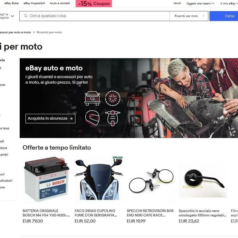 Tra l'altro, molte di queste categorie rientrano in una specifica campagna promozionale di eBay che comprende praticamente quasi tutto quello che potrebbe esservi d'aiuto per... iniziare vostra carriera di endurista o semplicemente a semplificare e rendere più conveniente la ricerca di ricambi e accessori: a cavallo del periodo di EICMA 2022 – dal 2 al 16 novembre - è infatti valida una promozione grazie a un coupon (valido soltanto se si paga con PayPal o con carta di credito/debito) che vi permette di risparmiare fino a 200 euro sui vostri ordini riguardanti la moto e la sua personalizzazione, ma non solo, e potete vedere i dettagli nella pagina dedicata; è possibile ricevere uno sconto del 15% fino a un massimo di 50 euro per singolo coupon, su una spesa singola del valore minimo di 15 euro; lo sconto massimo totale per utente è di 200 euro, con non più di quattro utilizzi del coupon per singolo utente, promozione che si aggiunge alla nota sicurezza scaturente dalla Garanzia cliente eBay e che contribuisce a distinguere in modo netto la piattaforma di eBay dai comuni siti di annunci.