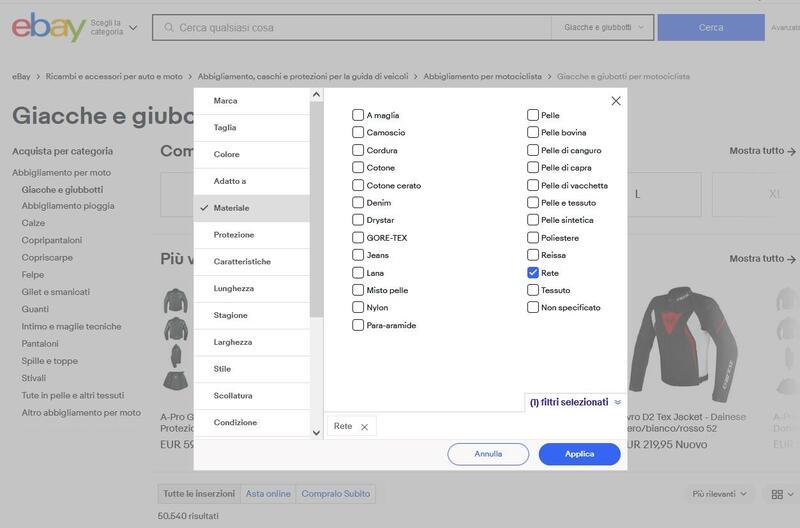 Punto di partenza su eBay.it quando si parla di passione motociclistica è la “solita” (nel senso che se ci seguite da un po' avrete probabilmente già imparato a conoscerla) sezione Auto e Moto all'interno della quale trovate la voce caschi e abbigliamento, quindi abbigliamento per motociclista dove è possibile andare nelle singole categorie e trovare la giacca, i guanti o le calzature adatte alla stagione calda per ventilazione e materiale, senza rinunciare alla sicurezza di un buon capo tecnico. Per fare un esempio, alla sezione giacche e giubbotti è facile affinare la ricerca selezionando tra i filtri la voce “rete”, all'interno della quale si trovano i giubbotti traforati. In questi casi il semplice utilizzo dei filtri permette di fare ricerche mirate ma anche di trovare accessori da cui trarre ulteriore ispirazione per migliorare la propria esperienza in moto come i gilet rinfrescanti, raggiungibili anche tramite una ricerca dedicata come tutta la selezione di prodotti presenti sul marketplace.