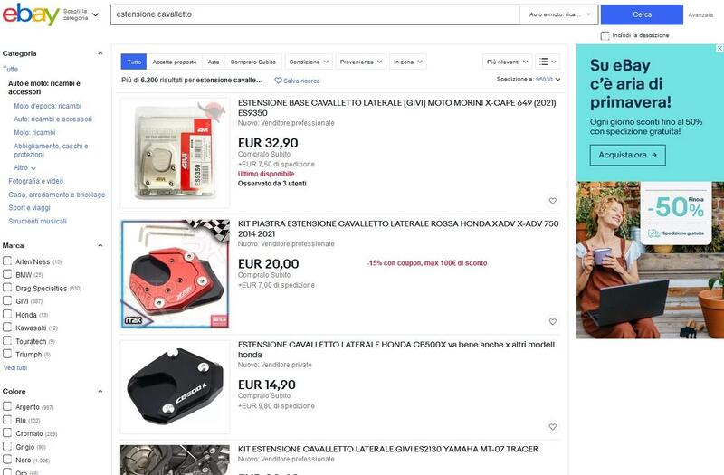 Per evitarlo potrebbe essere una buona idea quella di ampliare la base d'appoggio del cavalletto laterale attraverso un'estensione: anche qui, il campo di ricerca permette di individuare subito l'articolo che potrebbe salvare la vostra moto ed evitarvi di doverla rialzare sotto il sole cocente (o sulla terra bagnata, se per esempio andate in montagna), basta digitare estensione cavalletto per scegliere quello dedicato alla vostra motocicletta, ma ne esistono anche di universali, senza contare che potreste anche trovarli usati dato che la natura di eBay è quella di essere una community dove è possibile passare da acquirente a venditore senza soluzione di continuità, mantenendo sempre la sicurezza negli acquisti elevata grazie alla possibilità di resi semplificati e pagamenti sicuri garantiti anche dalla Garanzia Cliente eBay.