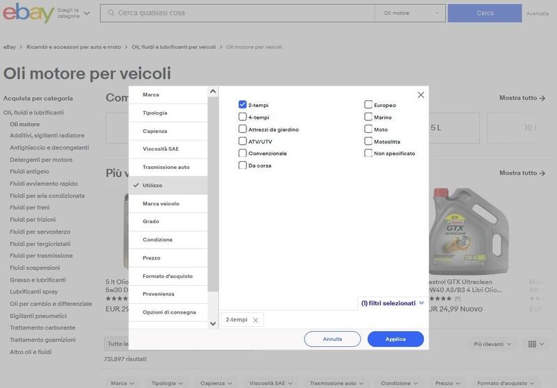 Andate al link “tutti i filtri”, validissima risorsa per raffinare le ricerche e trovare rapidamente quello che serve, e selezionate “utilizzo” e quindi “2T”. Si apre la pagina “olio motore-2 tempi per veicoli” dove poter trovare il lubirificante 2 Tempi che fa per voi: se possibile usate quello raccomandato dalla Casa produttrice del veicolo, tenendo ben presente che se gli oli si dividono in quelli per lubrificazione separata (ovvero, per le moto con un serbatoio separato dove immettere il lubrificante che viene poi miscelato in modo corretto e automatico dal miscelatore) e quelli per miscelazione manuale (il lubrificante va miscelato nella percentuale indicata dal Costruttore del motore direttamente nel serbatoio del carburante): in linea di massima un olio nato per la miscelazione separata potrebbe essere adatto anche alla miscelazione manuale, ma non vale l'inverso. Nel dubbio, acquistate sempre un olio specifico per il tipo di lubrificazione di cui è dotata la vostra moto o scooter. Inoltre è assolutamente inutile, e potrebbe anche causare qualche malfunzionamento del motore, acquistare un costosissimo olio progettato per le competizioni se l'utilizzo sarà quello scooteristico cittadino. Insomma, la scelta è ampissima e dal minerale (in genere il più economico) fino al sintetico esistono forbici di prezzo ampie che sono giustificate dalle prestazioni e dalla “pulizia” della combustione. Su eBay, inoltre, non sarà difficile trovare bundle che permettono di risparmiare.