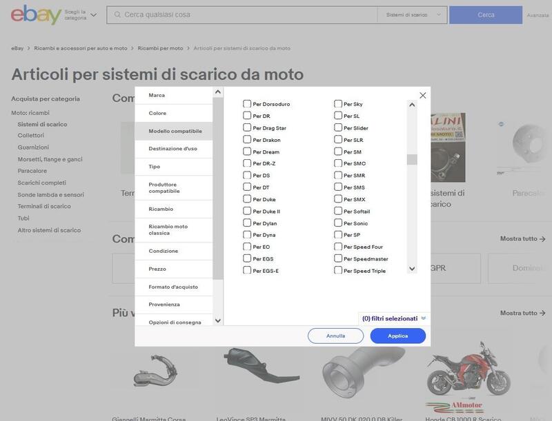 Se invece parliamo di aspirazione, su Articoli per aspirazione e iniezione per moto, sulle opzioni di sinistra, potete scegliere se dedicare le vostre attenzioni ai carburatori, filtri aria, ma anche ai convogliatori o ai pacchi lamellari (comprese le guarnizioni) cui potete anche dedicare una ricerca ad hoc. Stesso discorso per i gruppi termici (teste, cilindri e pistoni) cui potete dedicare una ricerca o trovare nella pagina Motore e ricambi per moto dove, cercando per categoria o per marca, avrete soltanto l'imbarazzo della scelta.