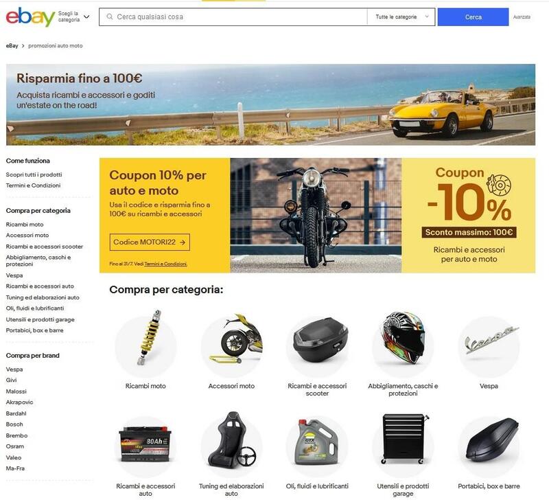 Se avete già trovato tutto quello che poteva interessarvi vogliamo segnalarvi un dettaglio tutt'altro che di secondo piano: la promozione valida fino al 31 luglio attraverso un coupon che assicura sui vostri ordini in... odore di due ruote a motore (ma non solo, vedete i dettagli nella pagina dedicata) uno sconto del 10% fino a un massimo di 100 euro per singolo coupon, per un acquisto minimo di 15 euro; lo sconto massimo complessivo per singolo utente è di 300 euro, con non più di tre utilizzi del coupon per singolo utente. Anche in questo caso è necessario che l'acquisto sia effettuato con PayPal o Carta di credito o debito e il venditore accetti questo metodo di pagamento, ma del resto pagare con moneta elettronica vi aiuta anche nel caso in cui la merce ordinata non arrivi o non sia conforme: in questi casi la Garanzia Cliente eBay , fa ottenere rapidamente un rimborso. Un altro dei motivi che può far scegliere eBay per la ricerca degli accessori per i motori a due tempi.