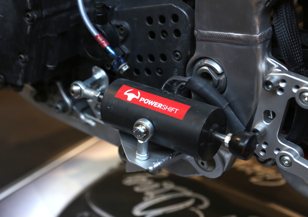 La frizione è del tipo autobloccante, naturalmente, mentre del cambio... non c'è traccia, se guardate nella solita posizione. I rapporti si innestano e scalano attraverso l'attuatore elettrico Powershift comandato dalla pulsantiera a manubrio, capace di garantire tempi di cambiata a livello di una F1 e - in un prossimo futuro - arriverà una mappatura programmata delle cambiate per ottimizzare ulteriormente l'accelerazione. Il contagiri? Non serve, c'è solo la shift light al centro del manubrio. E per le partenze c'è un launch control, che lascia al pilota il solo compito di modulare la frizione come avviene sulle moderne supersportive.