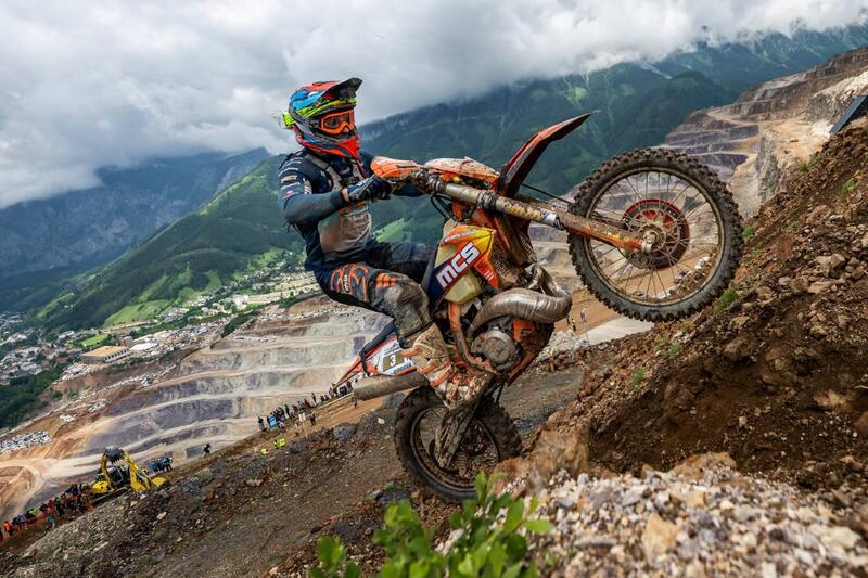 Alla finale dell’Erzberg Rodeo si arriva dopo tre giorni di festa del Motorsport e dell’Enduro, e nel tempo il “party” dell’Estremo è diventato un appuntamento irrinunciabile per centinaia di migliaia di appassionati. Oggi Karl Katoch, il creatore dell’Erzberg, è visto come un eccentrico businessman, ma il suo lavoro di un quarto di secolo parte da una visione un po’ folle ma di fatto “sanguigna”, istintivamente irresistibile nel mondo del Fuoristrada. E oggi quella visione è di diritto nel calendario del Campionato del Mondo hard Enduro, la serie derivata dal WESS alla terza stagione. La finalissima è riservata a 500 Piloti degli oltre mille iscritti, e si sviluppa su un tracciato di 35 chilometri circa dentro e attorno alla miniera sulla Montagna, il “Gigante di Ferro”. 23 Check Points e 4 ore di tempo per vincere o essere sconfitti dall'Erzberg Rodeo, quest’anno senza possibilità di ricognizioni, dunque più misterioso e insidioso. Come abbiamo visto, il Prologo della Gara, che dà il via alla lunga selezione per formare gli “schieramenti” della finale, è vinto da un ospite d’onore, Andrea Verona, che vola sul tracciato esemplare alimentando il sogno di un’altra “irruzione” al vertice dell’Hard Enduro di un Fuoriclasse dell’Enduro. Non sarà esattamente così… ma non si è andati molto lontano.