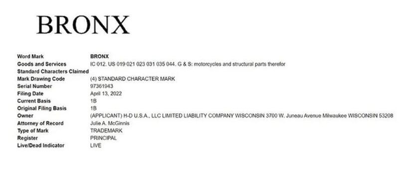 Il nome Bronx, già iscritto nella categoria motocicli e parti strutturali, era stato depositato una prima volta nel 2017. Tuttavia una nuova procedura americana introdotta pochi mesi fa e denominata Trademark Modernization Act fa sì che la titolarità del marchio depositato scada dopo tre anni nel caso di mancato utilizzo.