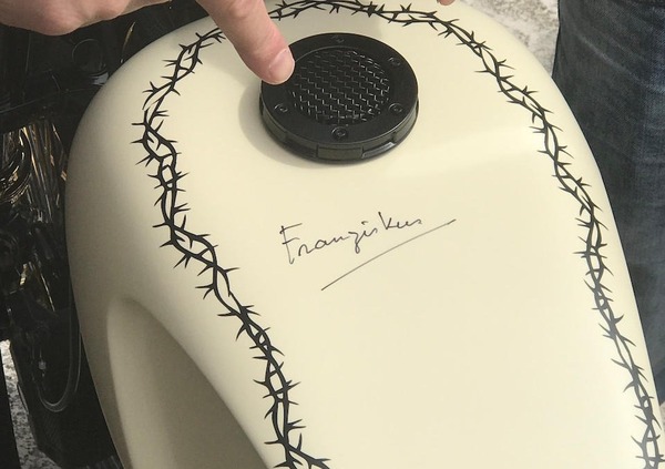 La moto creata, una custom ovviamente unica, presenta molti dettagli in stile Chicano, mentre il serbatoio è rifinito in colore bianco perla e riporta quella che, ad oggi, dovrebbe essere la firma più grande mai fatta dal Sommo Pontefice.