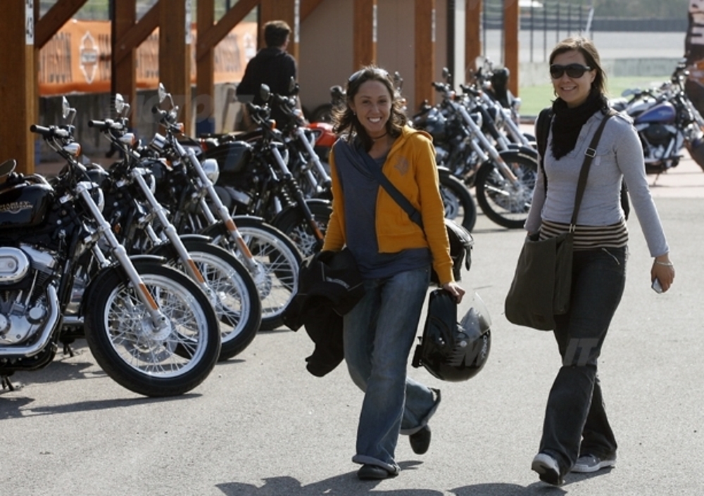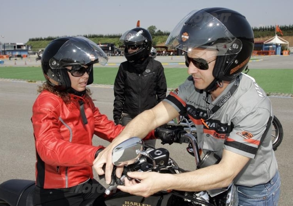 Prima del divertimento però tutte in classe! Anche per le esperte la lezione teorica ci ricorda i fondamentali della guida su strada, soprattutto nell’utilizzo di entrambi i freni per l’arresto della moto e di quello posteriore per aiutare a chiudere la curva in percorrenza. La messa in pratica denota pochissime cadute, sinonimo di ottimi istruttori e di motociclette adatte a tutti: nonostante le Harley abbiano un peso superiore alla media il loro baricentro basso aiuta moltissimo nell’appoggio di entrambi i piedi, fondamentale per trovare il giusto equilibrio.