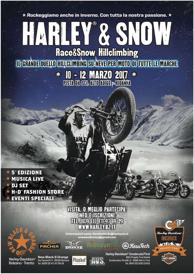Anche se non avete una Harley-Davidson ma amate la neve, le feste e il Rock & Roll segnatevi in calendario il weekend del 12 marzo, in cui la pista da sci di Ridanna (BZ) ospiterà la quinta edizione di Harley & Snow. Metà gara e metà festa, l'evento è aperto (nonostante il nome) a moto di tutte le marche; l'importante sono la passione e la voglia di fare festa.