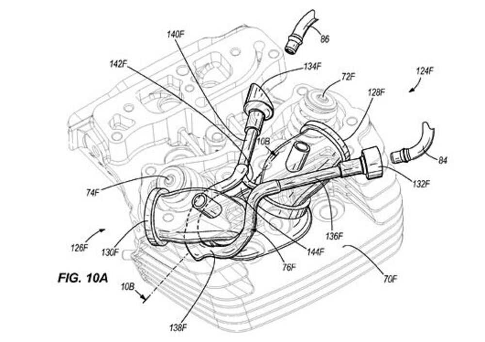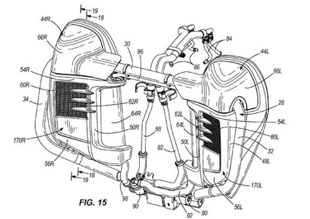 In giro circola da un po’ la voce che in Harley-Davidson si apprestino ad adottare il raffreddamento a liquido anche sui loro leggendari V2 raffreddati ad aria. Ed ecco che il sito americano The Kneeslider.com pubblica i disegni relativi al brevetto di una nuova versione dell’iconicoV2 Harley raffreddato ad aria, ma con le teste raffreddate a liquido. Ma sembrano evidentemente riferirsi alle unità che andranno ad equipaggiare uno o più modelli della gamma Touring, visto che il sistema refrigerante si affida a due piccoli radiatori (e relative ventole) alloggiati nella zona di protezione anteriore delle gambe. La relativa pompa dell’acqua è sistemata in basso, vicino al radiatore destro, e spinge il liquido attorno alle valvole. Secondo quanto scritto nel testo del brevetto, in ogni caso, il sistema appare piuttosto versatile, quindi adattabile a più modelli. E sembra decisamente pronto per entrare in produzione: Harley-Davidson, del resto, tradizionalmente presenta la sua nuova gamma all’inizio dell’estate, quindi non è escluso che a brevissimo potremo verificare se questa novità sarà presente su uno o più dei modelli 2012.
