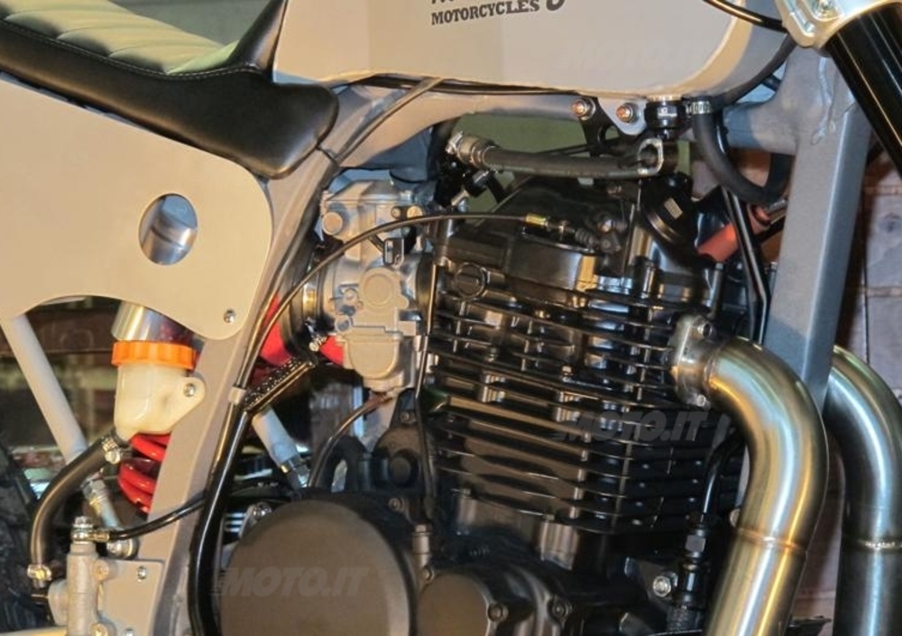 La nuova Headbanger “piccola” è naturalmente ispirata alle enduro anni settanta, monta un motore Honda 600 di derivazione XL alimentato a carburatore, tutto nero, per far contrasto al grigio dell’insieme, e che da voce ad uno scarico “2 in 1” (il motore ovviamente è a 4 valvole) realizzato in casa da Luciano Andreoli, ovvero colui che costruisce tutte le Headbanger, e che ha ideato anche questa Satèn da meno di 140 chili. La parte anteriore del telaio è pure di derivazione Honda, mentre le sospensioni sono Paioli, con forcella a steli rovesciati. Davanti spicca un discone da 330 mm con pinza HB Beringer a 4 pistoncini, mentre dietro troviamo un disco da 250, con pinza autoctona.