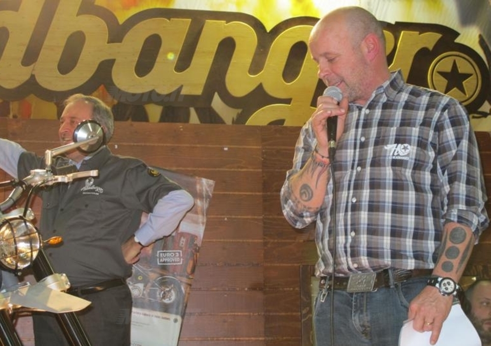 Certamente è abbastanza risaputo che a Giorgio Sandi, patròn di Headbanger, piacciano le sorprese, per di più enfatizzate a ritmo di rock. La cosa si è ripetuta all’MBE veronese, poco prima della chiusura della giornata: la novità che Sandi si apprestava a svelare è stata annunciata da un lungo riff di rock duro e graffiante (nella fattispecie Whole Lotta Love dei Led Zeppelin, mica paglia….) recitato da Sebo, il chitarrista della band ufficiale del Marchio bresciano, utilizzando Grace, la speciale chitarra realizzata da Ibanez per Headbanger.
