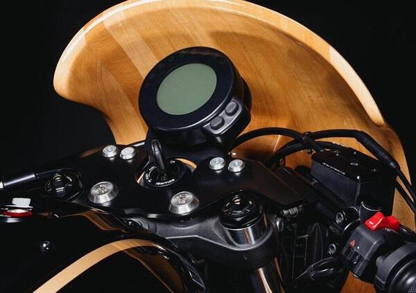 Tale considerazione non ha minimamente scosso George Woodman (nomen omen...) che, nella creazione di un omaggio alle moto da corsa degli anni 60 e 70, ha scelto il legno di faggio come materiale superficiale per la carenatura della sua special. Su una base di fibra di vetro e resina, usata come supporto per ottenere la forma desiderata, è stato applicato il legno, poi lavorato con la levigatrice con un numero di ore di lavoro che George preferisce non dichiarare...