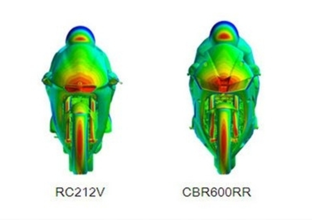Stavolta Honda ci spiega, usando l'analisi CFD (Computational Fluid Dynamics, Fluidodinamica computazionale) come la linea del cupolino, non a caso dichiarato del 6,5% più efficiente aerodinamicamente, interagisca con i flussi d'aria confrontandola con la RC212V da cui viene dichiarata la derivazione. La colorazione del grafico illustra le zone di pressione dell'aria sul cupolino, con colori che passano da rosso a blu con il diminuire della pressione stessa.